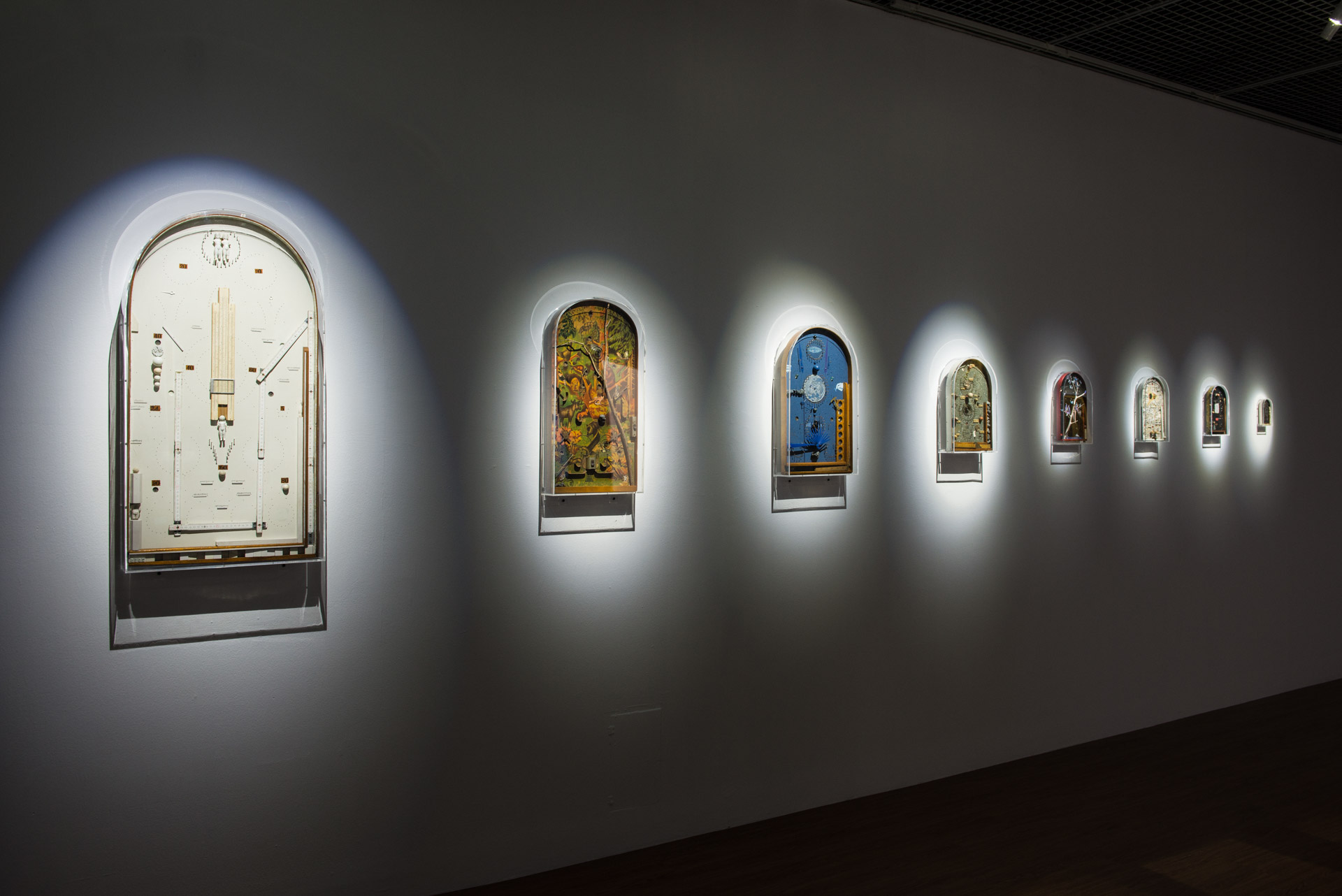 Ni Youyu was born in Ganzhou, Jiangxi, China in 1984. He graduated from the Fine Art College, Shanghai University in 2007, and was awarded "Best Young Artist" of Contemporary Chinese Art Award (CCAA), China in 2014. His artistic creation integrates Eastern and Western philosophical views and aesthetic ideals, and often centers on nature, time, and traditional culture. His subject matter ranges from the eternal universe and stars to the contemporary mundane world, incorporating his contemplation and thinking about time and space. His first solo exhibition at the MOCA, Taipei this time is a presentation of another stage after his solo exhibition at the Shanghai Art Museum in 2012. The exhibition title uses the idiom, “constant dropping wears away a stone,” which epitomizes Ni’s creative method and artistic spirit in recent years—many of his works have taken many years from the initial conception, to the preparation, and to their final completion. The procedures would inch forward little by little. Although time has seemed irrelevant in the process of making, these works are actually about time itself. In addition, the artist’s creative exploration and artistic attempts in painting, installation, sculpture, collage, and video are also showcased in the exhibition, enabling audience to have a comprehensive reading of the intricate connection between these works. Responding to the characteristic and historic architecture of the museum, Ni has specifically choreographed the exhibition and artworks according to the spatial ratio and distinctive quality of the gallery space. Freewheeling Trip at the beginning of the hallway is a panoramic natural landscape made with vintage black-and-white images, guiding audience’s temporal and spatial imagination in their movement through the exhibition. Shrine Series in R103 transforms wooden pinball machines collected from all over the world and converts them into still objects that are infused with a sense of sci-fi amusement or religious mysteriousness. Dust in R102 is a drawing of the starry sky on a blackboard, offering audience an opportunity to appreciate and experience the infinite beauty of the universe from a tiny classroom. Garden Pool is a combination of a rock garden and a pool, attempting to integrate ancient Chinese rock garden with familiar swimming pool design. It makes people feel like being in a tranquil, relaxed microscopic world. Pagoda II piles up unfinished lotus seats to imitate a pagoda building whereas Inches of Time is a work that presents variations of measurement predetermined by subjective perception. These installations are metaphoric instances that demonstrate how the artist has traversed and bridged the history and contemporary spirit while conveying symbolic meanings.