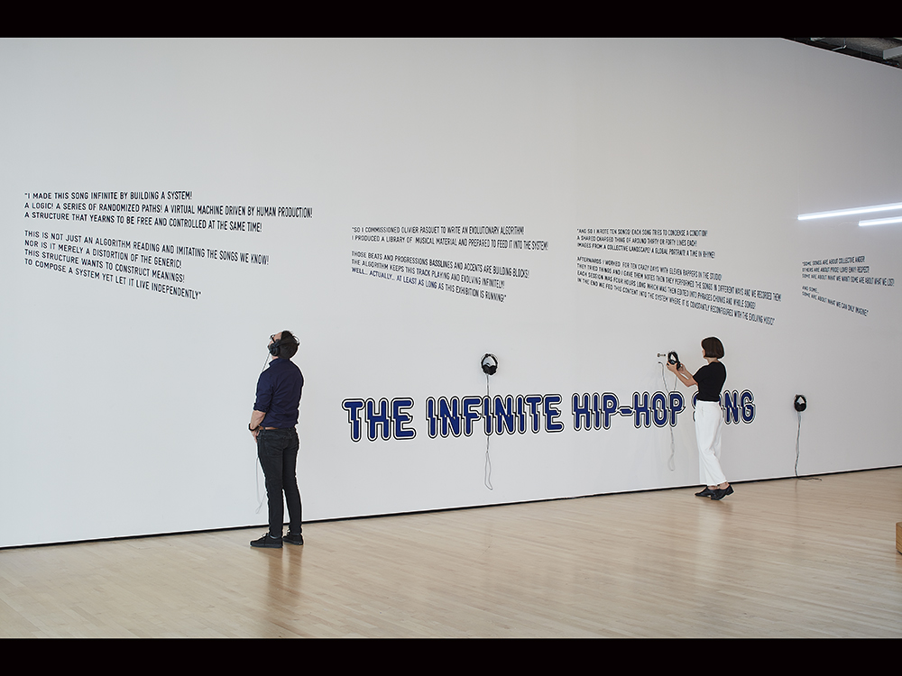 ●Egyptian artist Hassan Khan’s work The Infinite Hip-Hop Song is an algorithmic product. Once the computer boots up, it produces an endless, non-repetitive stream of hip-hop songs. The artist derives the vocals from the pre-recorded tracks by many hip-hop singers. This automatic composing system bears more than a passing resemblance to an autopoietic “organism.”
