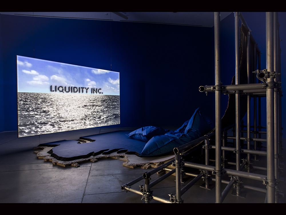 ●German artist Hito Steyerl’s work Liquidity Inc.can be interpreted as a survival strategy for individuals in face of the unstable and uncertain future (e.g., financial and market fluctuations or economic recession) in the liquid world. Bearing the signature of Steyerl’s message-based image, the protagonist in this work is a financial analyst who has been unemployed since the global financial crisis and implied to embody Bruce Lee’s philosophy of life: “Be water.” Steyerl also created an “immersive” environment for the visitors, as if they were temporarily sitting on the seats “amidst waves” to experience this work.