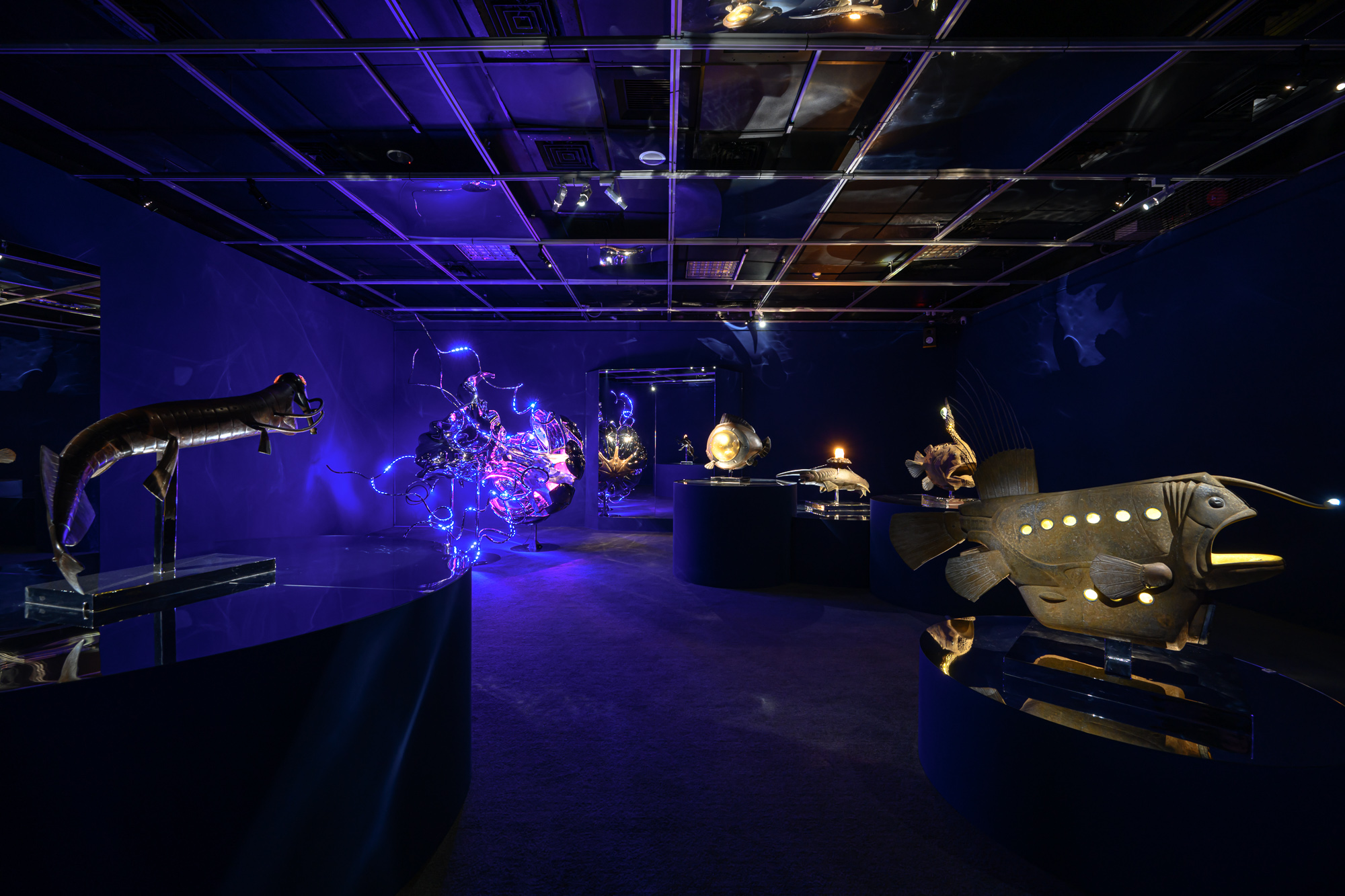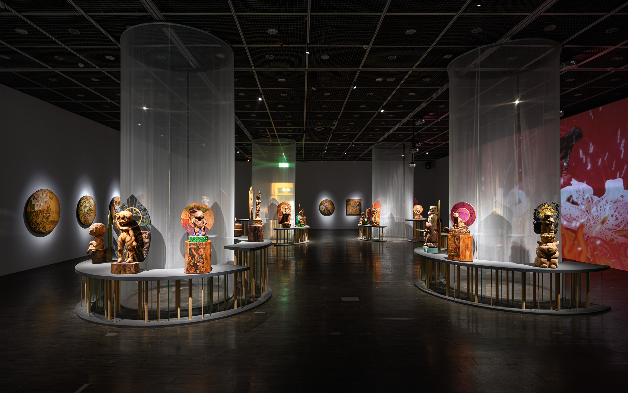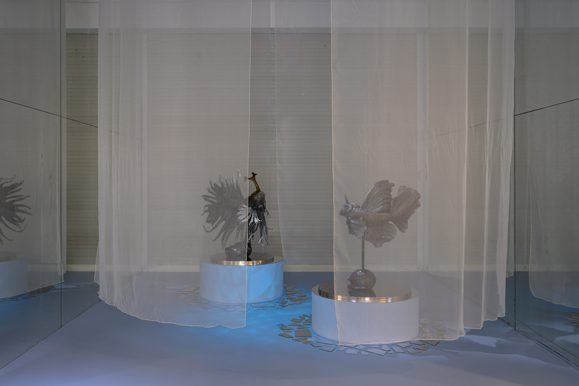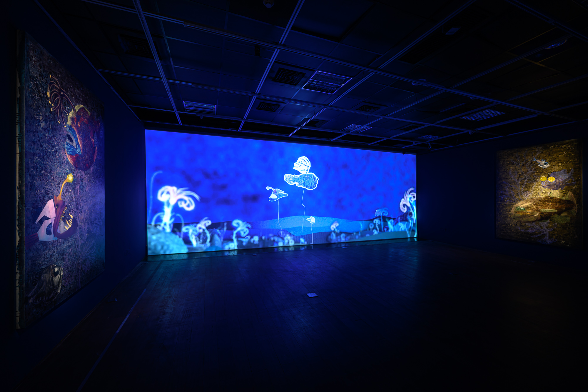 This exhibition at the Museum of Contemporary Art, Taipei revisits Yang’s decades-long internal art journey through these three series, Glittering Soul, Wanderers of the Abyssal Darkness , and The Lasting Spring, with two inverted curvatures further extended from Wanderers of the Abyssal Darkness and The Lasting Spring . With more than 60% of the exhibition composed of the artist’s latest creations, he collaborates with the WhiteDeer Animation Studios and sound artist Chen Yu-Jung, with 3D animated visual effects and a soundscape created for the exhibition to construct a large-scale immersive theater installation with projections of the deep sea and a phantom forest. This is an experimental project that recurrently tests the potential energy between the audio-visual environment created and the works of art, reinforcing the multi-layered somatosensory formations and highlighting the potential theological implications of Yang’s sculptures and paintings. Attempts are also made to use experimental curatorial methods to further expand contemporary art’s interdisciplinary energy, which leads to the organization of a workshop based on the exhibition theme. It calls upon people who are interested in literature, art, manga, and anime and welcomes families, adolescents, and anyone who cares about profound personal experiences. The intention is to transform MoCA TAIPEI into a place for inner journeys and dialogues, and in a time when people might be overwhelmed with the sentiments that “the world knows no mercy, and art is useless,” a lighter kind of salvation may be made possible through art and immersive experiences.