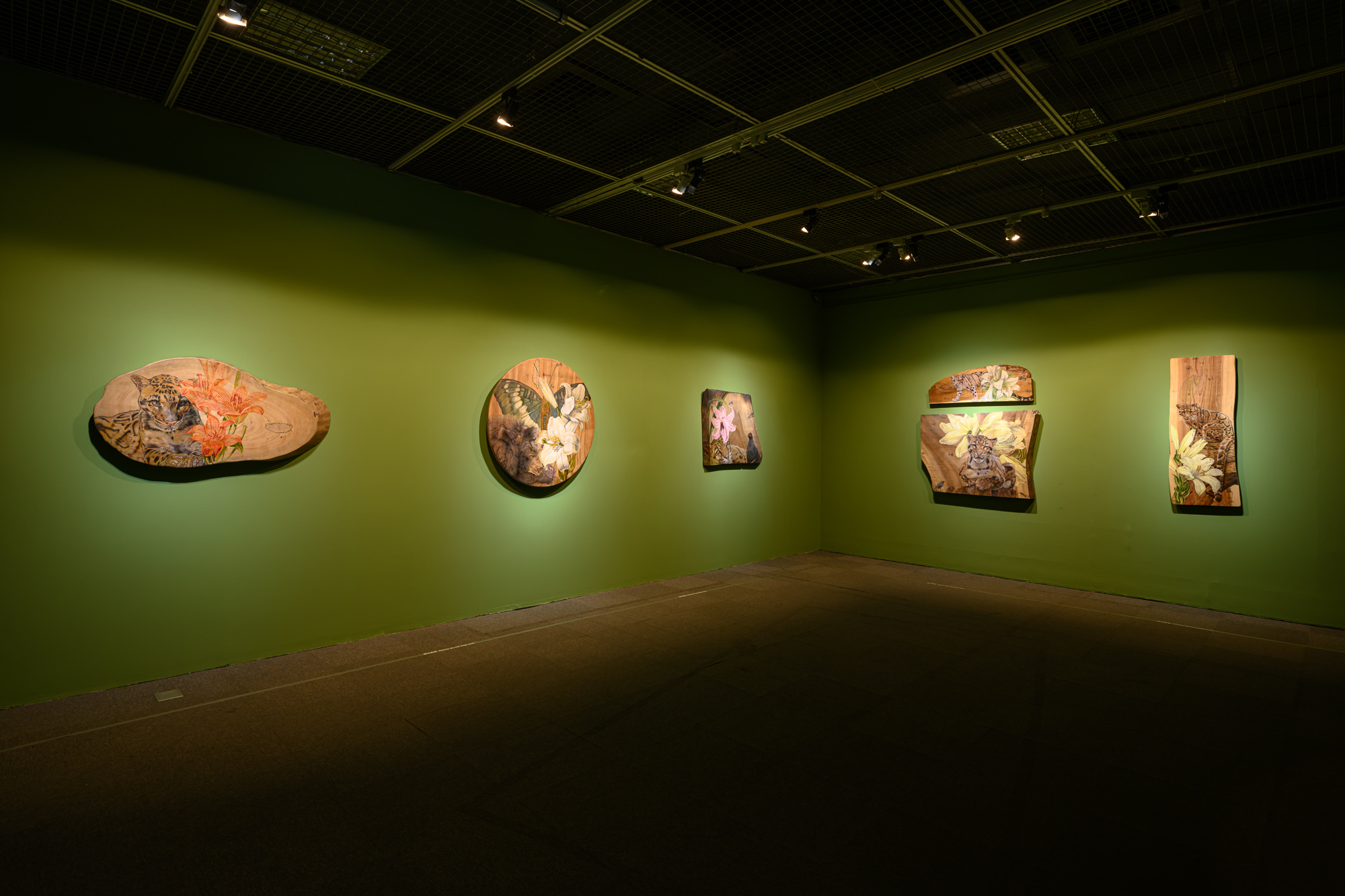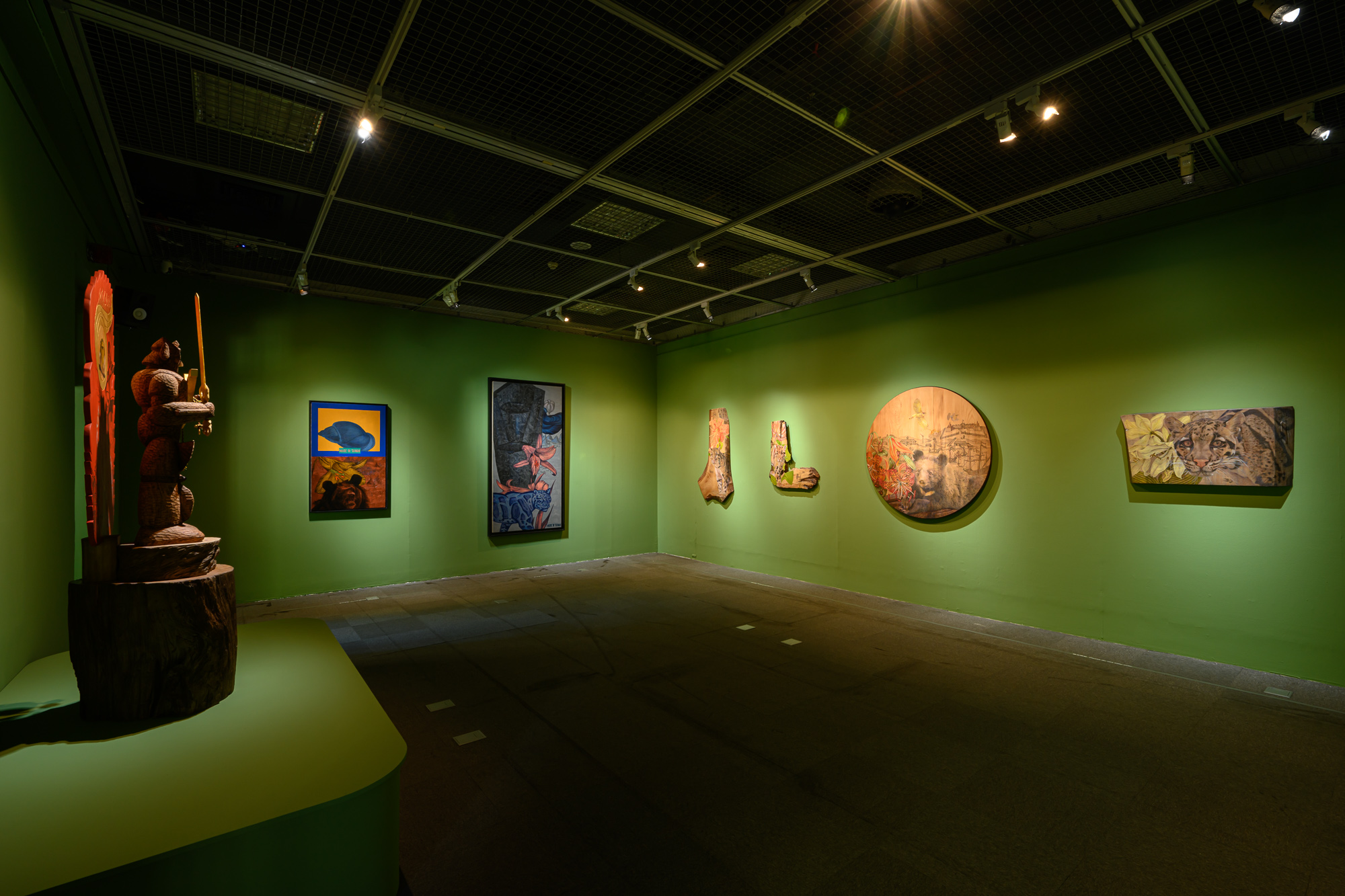 Facing today’s world, Yang began with a realm full of fierce mythical figures and characters engaged in historical battles, and he then embarked on a heroic path with the Innocent and the Wanderer, such as saints, immortals, robots, and also Alice and the Astro Boy. Then with brisk and enthusiastic steps, he gradually leaped away from the cumbersome shackles of history and even tried to detach from humankind’s blood-stained past, which then took him on nighttime excursions to explore splendid fighting fish and bizarre deep-sea creatures, before entering a magical eternally spring tropical forest, with blossoming lilies, clouded leopards, Formosan black bears, crows, insects, and fish tattooed on wooden blocks. The artist then embarked on the ultimate return journey of redemption for all sentient beings and the call of the wild. From the trinity of painting, iconography, and sculpture to the coming together of the trio of brushstrokes, wood, and metal, and from his early path of hope for the Innocent and the Orphan who fell or were forgotten by the heavenly kingdom, and the scenes of the rise and fall of power with the Martyr and the Warrior who saved the world and fought against violence, Yang’s creative journey traveled to Glittering Soul, where the fighting fish’s tenacious will was experienced and then to Wanderers of the Abyssal Darkness to be accompanied by a school of deep-sea fish and surrounded in an ambiance of profundity, solitude, autonomy, and alertness. He then freely transitioned to an emerald jungle of The Lasting Spring, where primal instincts were liberated and all beings became one; it was where the mind was joyful, light, and calm. With all gods congregated, the dusk is yet to be over. This exhibition intends to delve deeper into what kind of contemporary divinity Yang is trying to achieve with “Rescues in Time.” Is it the art world’s Warrior or Martyr? Or is it the Innocent with no worldly goals, the Wanderer who follows and drifts along, or the Orphan who was left behind in the deep sea? Perhaps, it’s the mystical beast that’s immersed holistically in nature and protected by the gods, or those characters that came to the rescue represent the journey of the hero within the artist, as he faces himself and goes through personal adjustments.