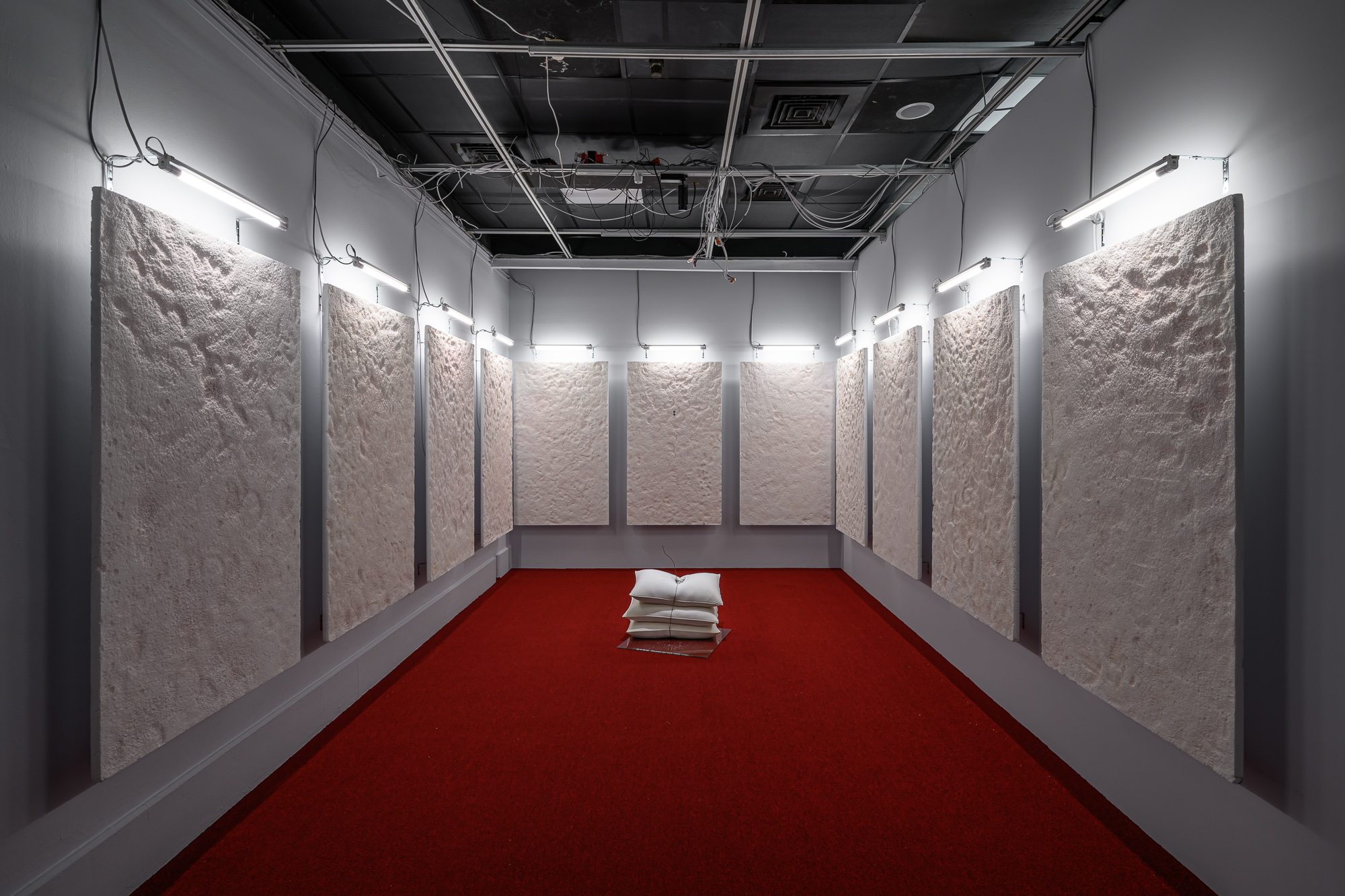 Leaning against the shelter while following the air raid evacuation instructions, one lowers the body and carefully enters this space. In scenes that intertwine disasters, wars, personal crises, and social relations, Safe Room illustrates a complex reality characterized by overlapping layers and tectonic fissures that separate individuals. Following this framework, the exhibition showcases a refuge that temporarily protects against imminent threats within a dynamic landscape that is constantly morphing, obscuring, and shaping itself. By envisioning such an alternate space, the exhibition not only erodes the boundaries of safety and isolation but also broadens our imagination of disasters.