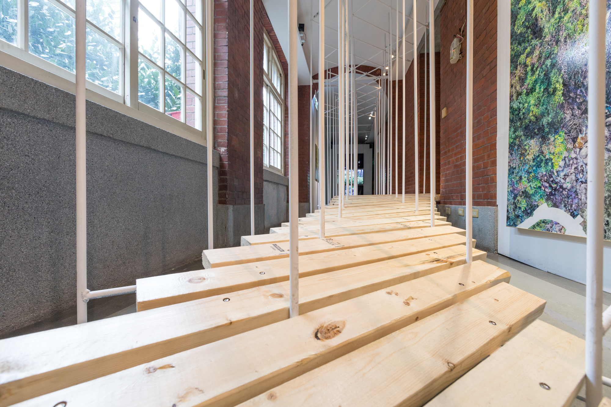 The final part of the exhibition returns to the forest scenery in Taiwan. Walking into Suspended Bridge created by CHEN Xuan-Cheng /ArchiBlur Lab, audience will see HUNG Tien-Yu's new painting, Tianshuei Waterfall at the beginning, which exudes the charm of ink painting. At the end of the bridge, another painting by HUNG, The Upstream of Chilidan Stream, greets the audience with delicate delineation of the lively and lush primitive mountains in Taiwan. Also at the end of the bridge, French artist Alice Mallet shows her video work of Photinia serratifolia filmed at Bois des Moutiers with an underscore by Norman Yamada. This particular Photinia serratifolia was transplanted in a garden in Normandy, France, and has now returned to Taiwan in the form of a video. Through this section, the exhibition reexamines the problematic of "ecolonialism" in the context of globalization while responding to the cultural thinking of recontextualization in this eco action of "returning the land to trees."