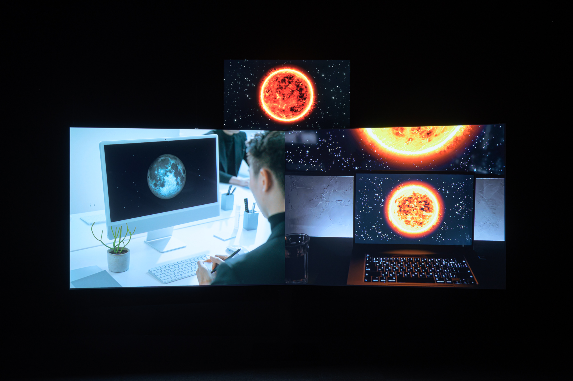 「2ENTER 貳進」團隊由新媒體藝術創作者莊恩齊、陳政維、邱傑義、劉吉榮所組成,主要以影像裝置、動畫、網路資訊、遊戲引擎進行視覺藝術創作。近期創作專注於收集大量網路數據將其轉譯為具當代性的符號,並於遊戲引擎中重組,在作品中建構一虛擬網路生態系統。